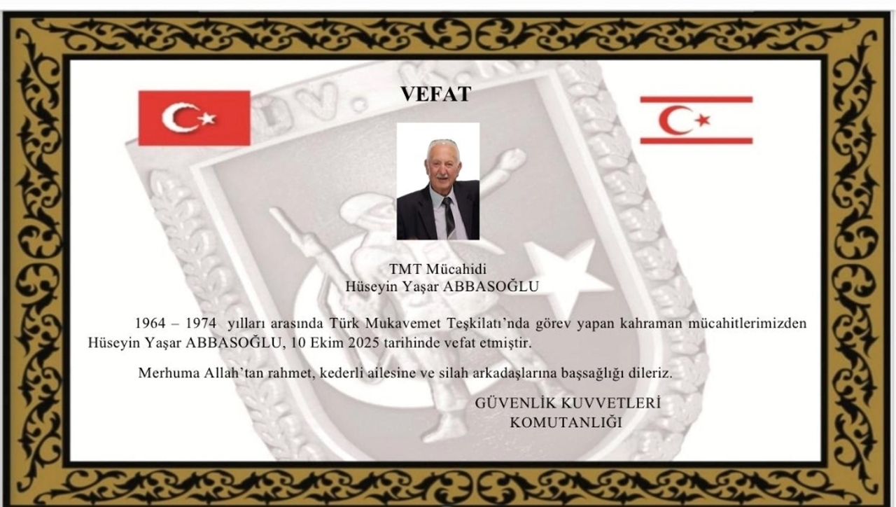 1964 – 1974 yılları arasında Türk Mukavemet Teşkilatı’nda görev yapan kahraman mücahitlerimizden Hüseyin Yaşar ABBASOĞLU, 10 Ekim 2025 tarihinde vefat etmiştir.